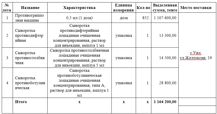 Заказчик и/или организатор: Государственное коммунальное предприятие «Уилская центральная районная больница» на праве хозяйственного ведения государственного учреждения «Управление здравоохранения Актюбинской области», 030900, Республика Казахстан, Актюбинская область, Уилский район, Уилский с.о., село Уил, ул.Желтоксан, 19.