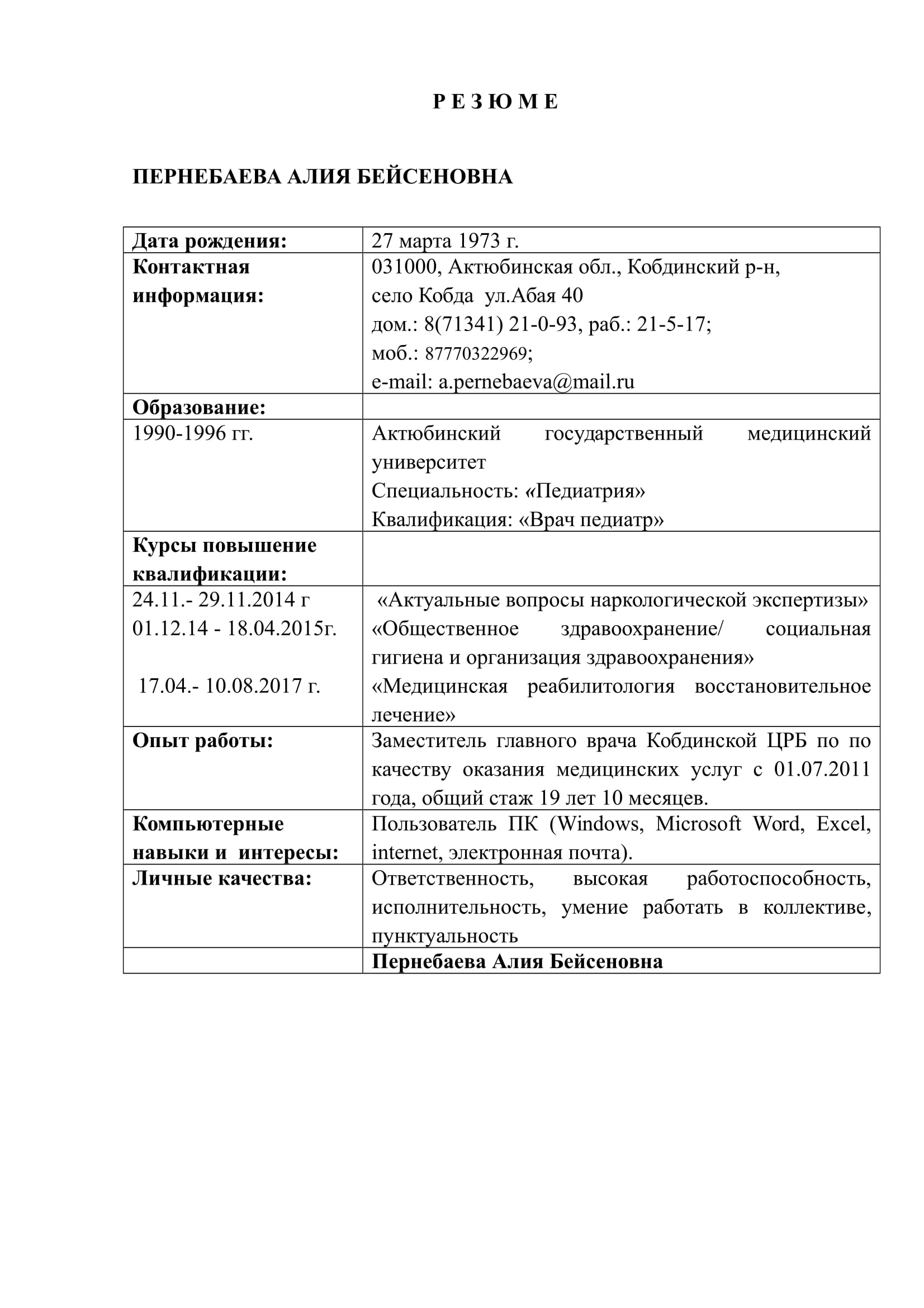 ПЕРНЕБАЕВА АЛИЯ БЕЙСЕНОВНА